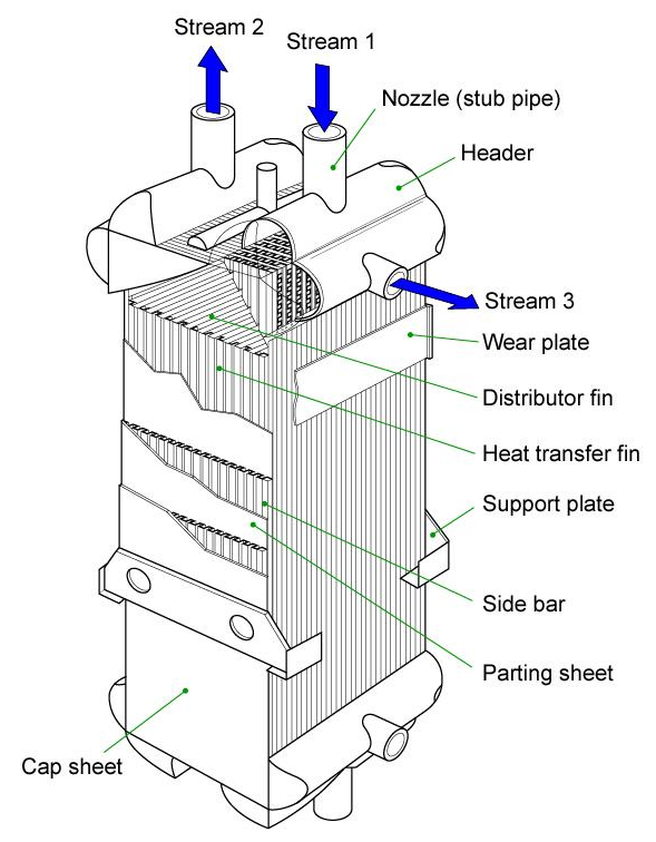 Carefully-placed gaps are provided in the side bars to allow the fluid streams to connect with headers which are welded onto the block. Distribution devices are incorporated into the block to ensure that the fluid stream is spread evenly over the full width of the flow path. BAHXs are typically designed to handle several streams in the same exchanger although they are also excellent devices for two streams. The figure below illustrates part of a typical exchanger.